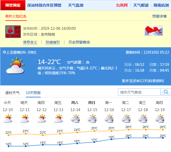 見圳客戶端·深圳新聞網(wǎng)2019年12月10日訊 今日深圳晴天間多云,空氣干燥;氣溫14-22℃;偏北風(fēng)2-3級;相對濕度25%-70%。