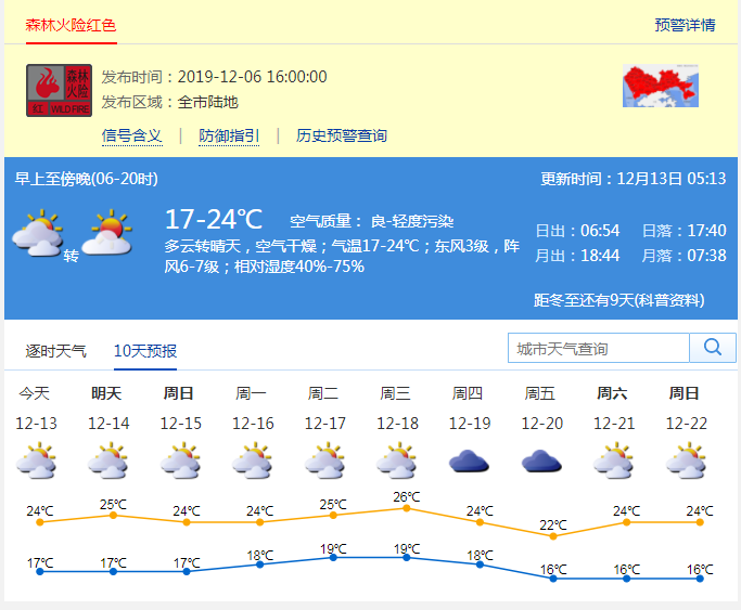 東南風3級,東部及沿海陣風6-7級;相對濕度50%-75%;能見度介于6-13公里之間。深圳市森林火險紅色預警信號生效中。日間空氣干燥,注意用火安全及時補充水分。