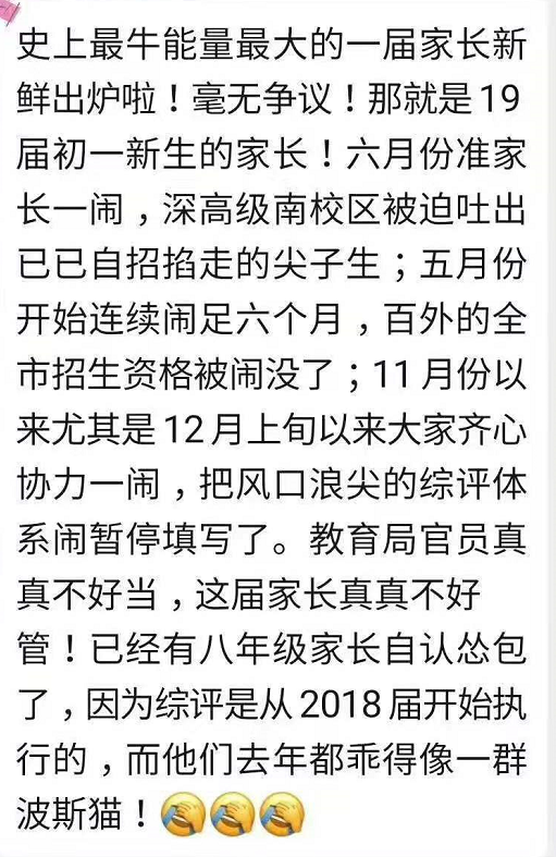 在家長的各種吐槽之下,12月11日,教育局召開了座談會:決定暫停2019年深圳市初中學(xué)生綜合素質(zhì)評價填報工作。