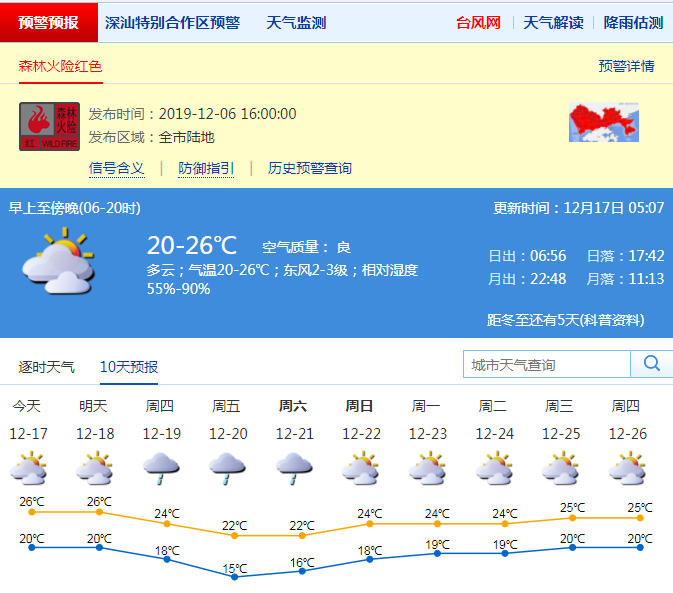 見圳客戶端·深圳新聞網(wǎng)2019年12月17日訊 深圳市氣象局預(yù)計17-18日多云,早晚有輕霧,天氣溫暖;19-21日受冷空氣影響,陰天間多云,有分散小雨,氣溫下降,天氣明顯轉(zhuǎn)涼。22日多云,氣溫回升。17-18日早晚有輕霧,注意交通安全。