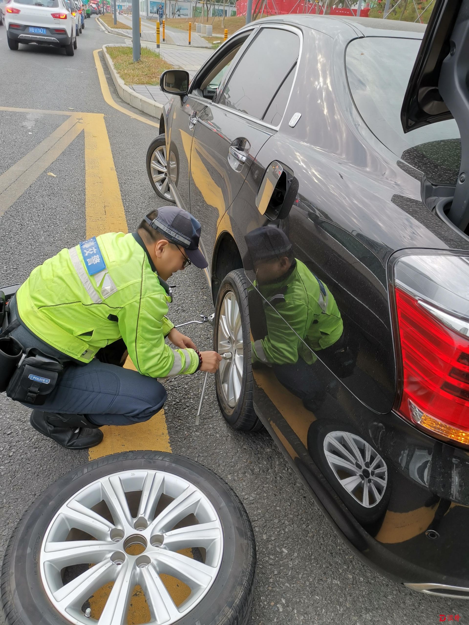 正當記者心急如焚且束手無策之時,在路上巡查的福田交通大隊香蜜湖中隊鐵騎鄭彬銳警官途經此地,見狀他立即停住鐵騎,上前詢問情況。當他看到車輛左側兩輪均癟下時,立即問記者是否有備胎,同時讓記者趕緊聯(lián)系車行再送一個備胎過來。