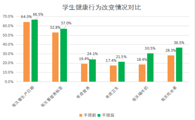 通過1學年的營養(yǎng)教育活動,評估發(fā)現(xiàn),學生選擇經(jīng)常吃的零食中,水果類排名第一,占69.6%;糖果類由26.6%明顯下降至19.9%,降幅25%。經(jīng)常喝的飲料依次是白開水、純牛奶酸奶、果汁和碳酸飲料,干預后白開水和牛奶比例分別提升至83.4%和76.7%,升幅均超過10%;果汁和碳酸飲料分別降低至38.9%和17.3%,尤其是碳酸飲料降幅超過了30%。每天喝牛奶的比例明顯提升至30.5%,升幅65.8%;每天吃水果的比例提升至36.5%,升幅達到36.5%。每天吃早餐的比例由67.8%上升至74%。