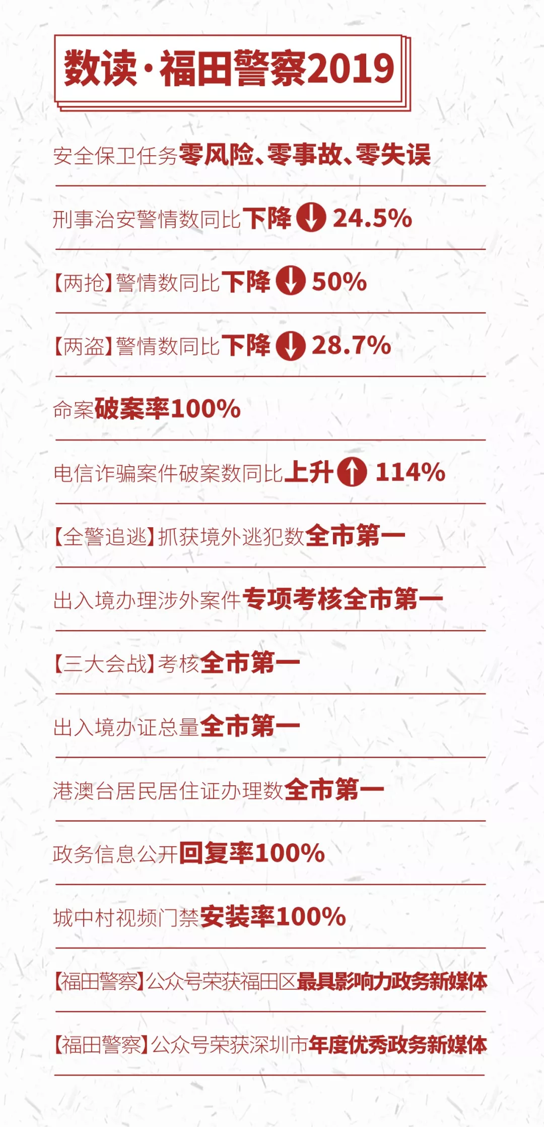 剛剛過(guò)去的2019年,是福田公安勇?lián)姑?,砥礪奮進(jìn)的一年,在市局黨委和區(qū)委區(qū)政府的堅(jiān)強(qiáng)領(lǐng)導(dǎo)下,福田公安穩(wěn)中求進(jìn)、攻堅(jiān)克難,穩(wěn)妥應(yīng)對(duì)化解系列重大風(fēng)險(xiǎn),有效護(hù)航中心城區(qū)社會(huì)政治穩(wěn)定,打贏新中國(guó)成立70周年大慶安保和澳門回歸20周年慶典安保攻堅(jiān)戰(zhàn),各項(xiàng)重大安?;顒?dòng)“零風(fēng)險(xiǎn)、零事故、零失誤”;強(qiáng)力推進(jìn)掃黑除惡、“颶風(fēng)2019”等一系列專項(xiàng)行動(dòng),合成打擊效能突顯;持續(xù)推動(dòng)現(xiàn)代化警務(wù)機(jī)制變革,改革攻堅(jiān)蹄疾步穩(wěn);提升社會(huì)治安基礎(chǔ)治理工作,治安面貌持續(xù)向好;隊(duì)伍建設(shè)舉措剛?cè)嵯酀?jì),錘煉“四個(gè)鐵一般”的過(guò)硬警隊(duì)。