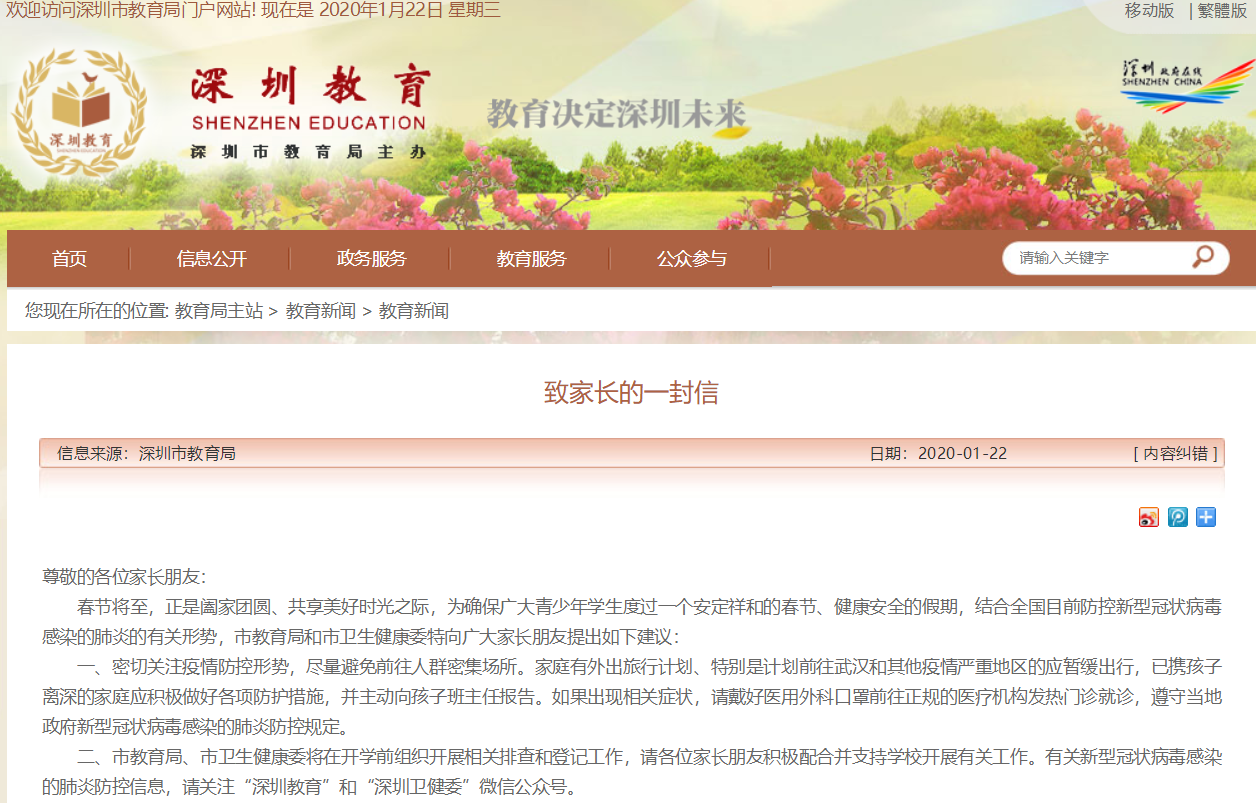 見圳客戶端·深圳新聞網2020年1月22日訊 1月22日,市教育局下發(fā)《深圳市教育系統(tǒng)新型冠狀病毒感染的肺炎疫情防控工作方案》的通知,引導師生假期盡量不要前往武漢和疫情嚴重地區(qū),并要求校外培訓機構即日起全面停止春節(jié)假期補課。