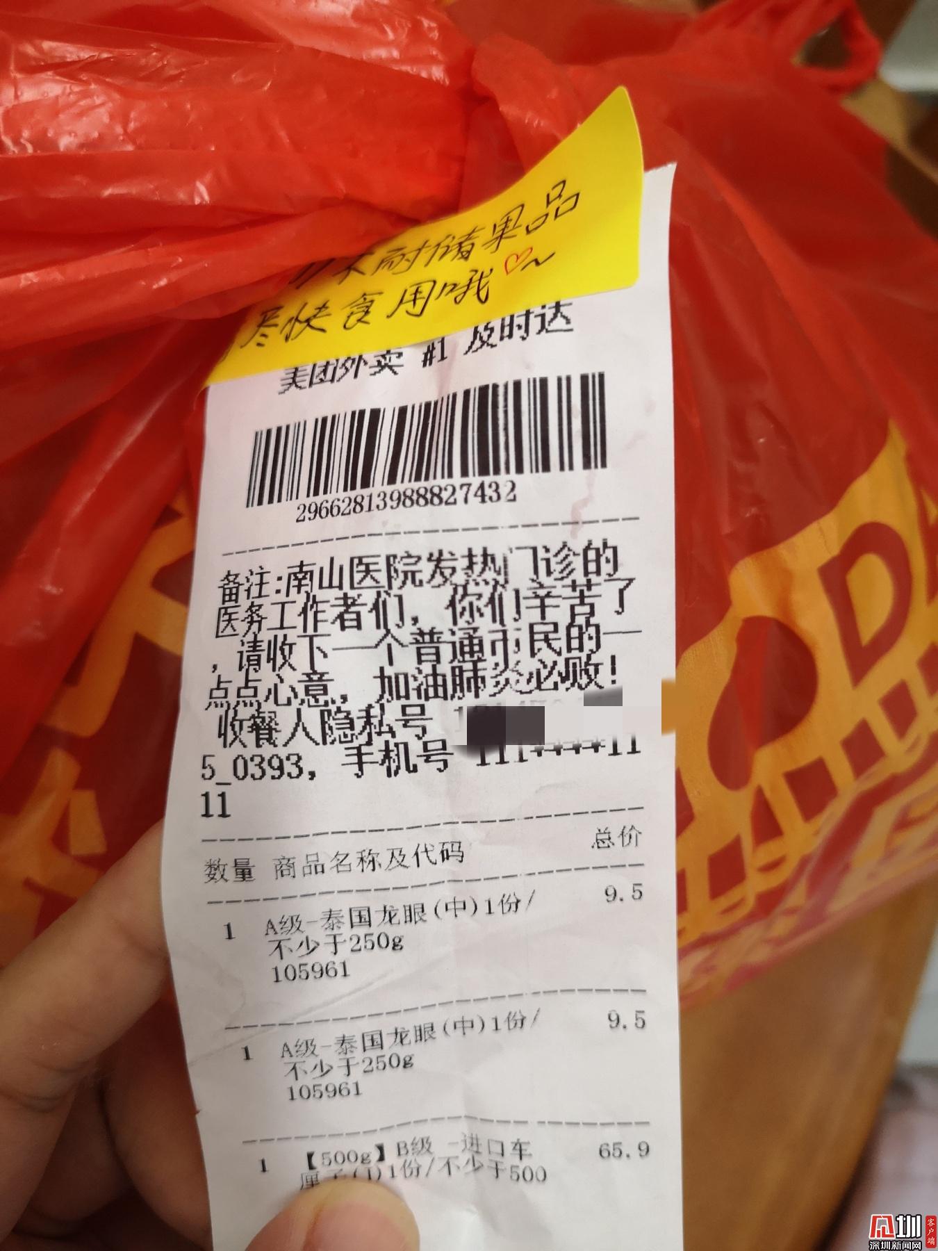 見圳客戶端·深圳新聞網(wǎng)2020年2月1日訊 (見圳客戶端、深圳新聞網(wǎng)記者 劉夢婷 通訊員 深協(xié)和)“老淚縱橫!”1月30日晚上8點(diǎn)56分,華中科技大學(xué)協(xié)和深圳醫(yī)院(南山醫(yī)院)手外科護(hù)士王敏在朋友圈曬了一張照片,瞬時(shí)網(wǎng)友們紛紛點(diǎn)贊。照片里是一個(gè)紅色塑料袋上貼著一張外賣單,備注上寫著,“南山醫(yī)院發(fā)熱門診的醫(yī)務(wù)工作者們,你們辛苦了!請收下一個(gè)普通市民的一點(diǎn)點(diǎn)心意,加油,肺炎必?cái)?!?/p>