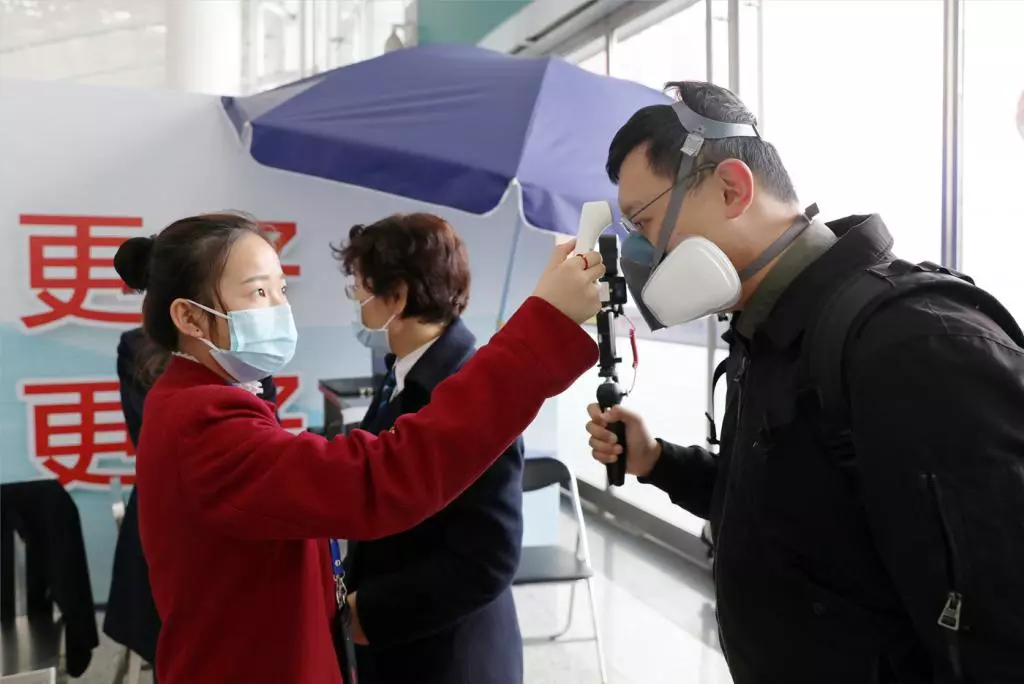 深圳北站工作人員對(duì)旅客進(jìn)行體溫檢查。