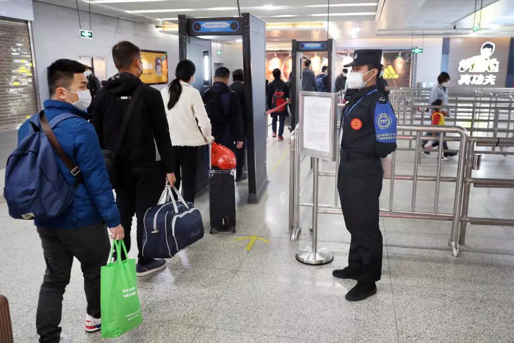 在地鐵站入口處,安檢人員檢查乘客是否佩戴口罩,并對未佩戴口罩人員進(jìn)行勸返。