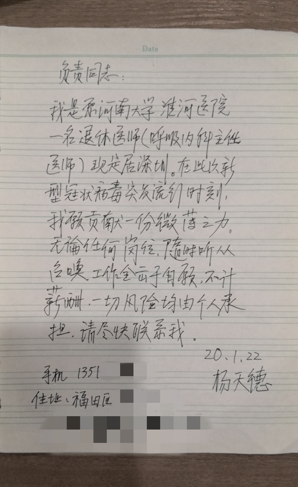 深圳新聞網(wǎng)2月4日訊(見圳客戶端、深圳新聞網(wǎng)記者 邱曉潔)1月23日,福田街道海濱社區(qū)工作站收到一封請愿書,上面寫著:“我愿貢獻一份微薄之力,無論任何崗位,隨時聽從召喚,工作全出于自愿,不計薪酬,一切風險均由個人承擔?!痹谡堅笗淖詈?,還附上了自己和愛人的聯(lián)系電話及住址。