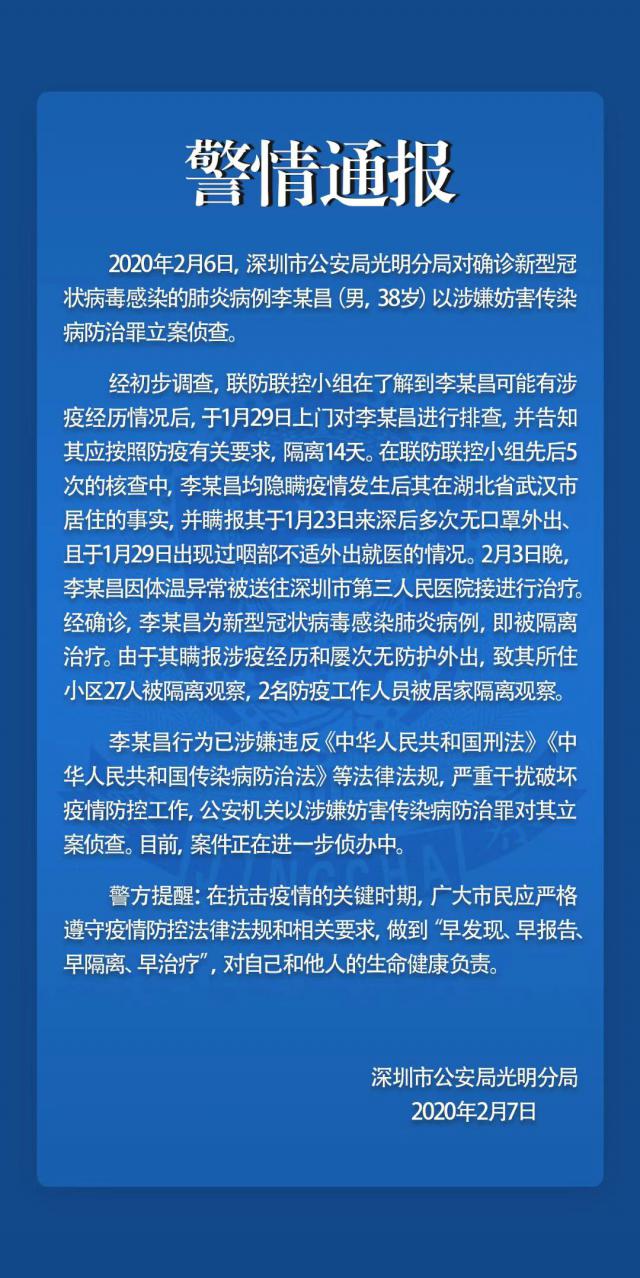 經(jīng)初步調(diào)查,聯(lián)防聯(lián)控小組在了解到李某昌可能有涉疫經(jīng)歷情況后,于1月29日上門對(duì)李某昌進(jìn)行排查,并告知其應(yīng)按照防疫有關(guān)要求,隔離14天。在聯(lián)防聯(lián)控小組先后5次的核查中,李某昌均隱瞞疫情發(fā)生后其在湖北省武漢市居住的事實(shí),并瞞報(bào)其于1月23日來深后多次無口罩外出且于1月29日出現(xiàn)過咽部不適外出就醫(yī)的情況。2月3日晚,李某昌因體溫異常被送往深圳市第三人民醫(yī)院接進(jìn)行治療。經(jīng)確診,李某昌為新型冠狀病毒感染的肺炎病例,即被隔離治療。由于其瞞報(bào)涉疫經(jīng)歷和屢次無防護(hù)外出,致其所住小區(qū)27人被隔離觀察,2名防疫工作人員被居家隔離觀察。