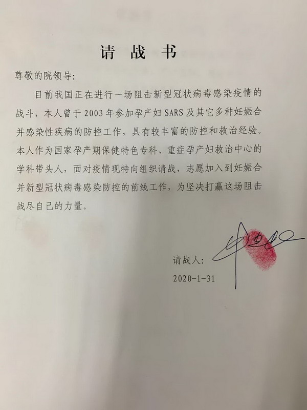 面對疫情,黨員干部紛紛向科室提交請戰(zhàn)書并莊嚴(yán)宣誓,志愿參加疫情防控的阻擊戰(zhàn)。產(chǎn)科共收到200多份請戰(zhàn)書,特別是有三名孕婦請纓,令人動容。請戰(zhàn)人員組成了三個防控梯隊,為醫(yī)院妊娠合并新型冠狀病毒感染防控奠定了強大的人力資源保障。