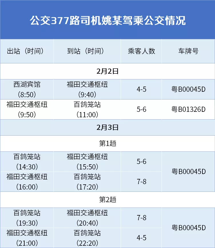 2月3日,姚某經(jīng)過崗前體溫檢測正常后,分別于14時30分至17時20分(粵B00045D)、19時30分至22時20分(粵B00045D)駕車往返白鴿籠站至福田交通樞紐兩趟,乘客共27名。期間車載視頻確認(rèn)姚某佩戴口罩、車輛有出站前后消殺記錄、運行途中開窗通風(fēng)。當(dāng)晚22:20下班回家后,姚某接江西老家告知,其在老家接觸過的堂弟已確診感染新冠病毒。
