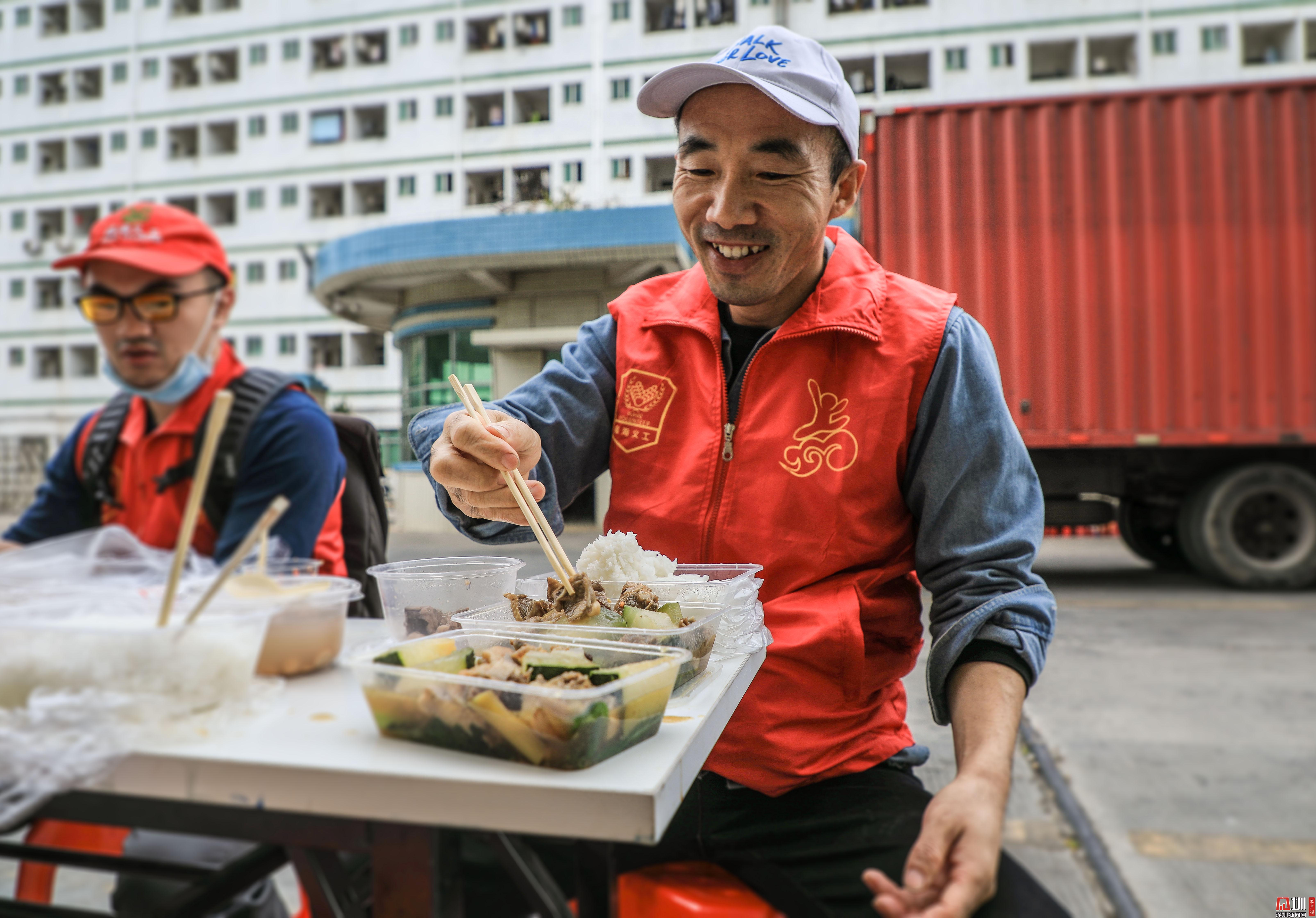 擺好桌子后,郭建庚便去排隊(duì)為義工們領(lǐng)來午餐,在工廠門口負(fù)責(zé)幫忙招工的兩位義工不能離崗,郭建庚便把午餐另外給他們送了過去。