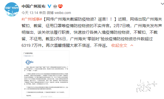 2月7日晚,廣州海關(guān)發(fā)布聲明稱,網(wǎng)絡(luò)“廣州海關(guān)暫扣、截留、征用口罩等疫情防控物資”為不實傳言。目前,廣州海關(guān)依法履行職責(zé),快速放行各類入境疫情防控物資,不暫扣、不截留、不征用。截至2月6日,廣州海關(guān)“零延時”驗放疫情防控物資總件數(shù)超過6319.7萬件。上海、天津、寧波、大連、鄭州等地海關(guān)也紛紛辟謠,表示不會征用個人口罩。