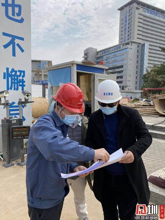 龍海波(左一)在“深圳版火神山”——市第三人民醫(yī)院二期工程臨時(shí)院區(qū)項(xiàng)目現(xiàn)場勘察供電線路。(蕭新敏 攝)