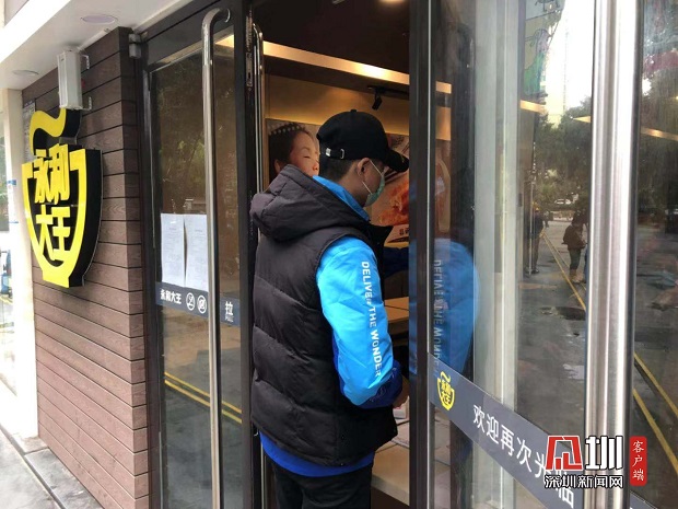 外賣小哥前來永和大王店前領(lǐng)取外賣。