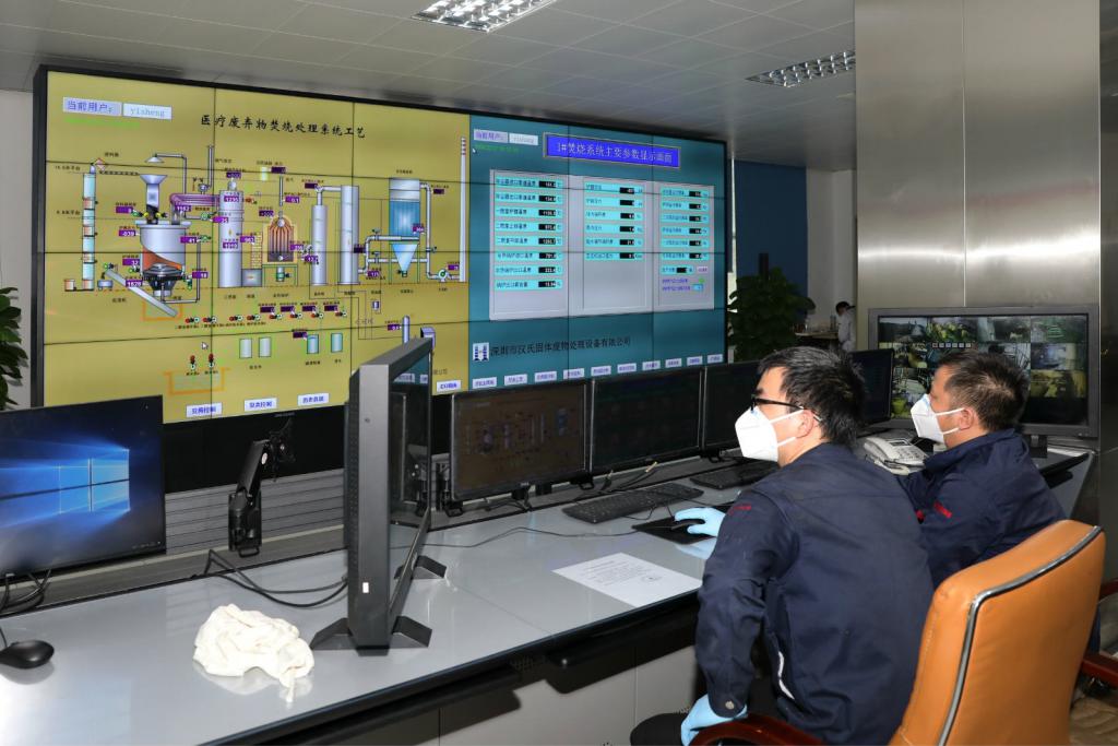 ▲大屏幕顯示的是醫(yī)療廢物處置工藝流程。
