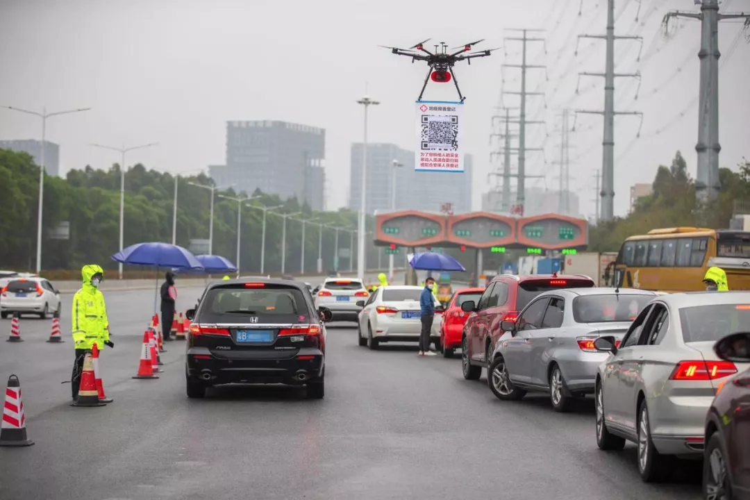 2月11日,在G94高速深圳觀瀾收費(fèi)處,深圳龍華機(jī)訓(xùn)大隊(duì)無人機(jī)飛行隊(duì)的民警操作懸掛有申報(bào)二維碼的無人機(jī)在候檢的車輛間飛行。