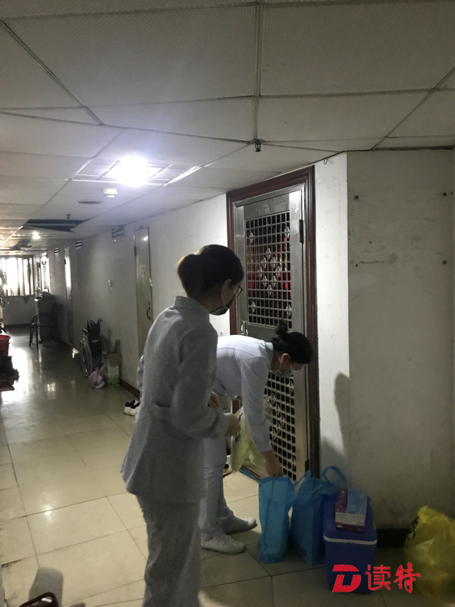 孫女士打開門,將工作人員遞進去的防護裝備穿戴完畢。“為了保護醫(yī)護人員的安全,減少交叉感染的可能性,所有的上門檢測都會在樓道里進行?!鄙缈抵行墓ぷ魅藛T說。提前穿好防隔服等防護裝備、拿檢測時給居民坐的凳子、為凳子消毒,開始進行檢測前就需要做很細致的準備工作。