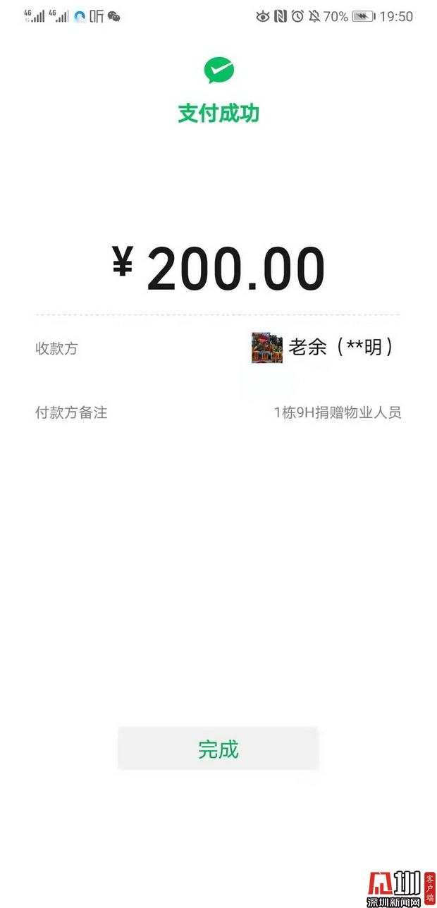 日前,深云村居民在微信群里討論小區(qū)防疫工作時,談到物業(yè)服務中心在防疫工作中投入大量人力物力,在防疫物資和人員不足的情況下加班加點地工作,有居民提議想對小區(qū)物業(yè)服務中心防疫一線的工作人員進行“打賞”,表達對他們的感激之情。深云村業(yè)委會聞訊后,迅速對這一提議進行了跟進討論,并于2月6日向小區(qū)居民發(fā)出《關(guān)于為深云村物業(yè)服務中心防疫一線員工打賞的倡議書》,呼吁小區(qū)居民以戶為單位通過手機掃碼的方式向特定賬戶“打賞”,得到居民的熱烈響應。據(jù)了解,截至2月12日16:47,該小區(qū)居民共打賞982筆,總金額達119237.54元。
