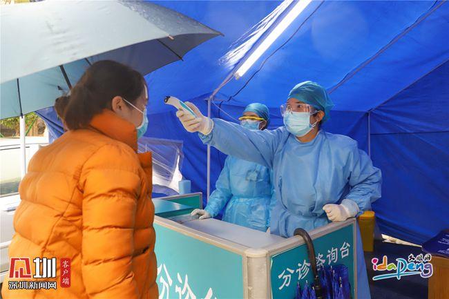 在葵涌人民醫(yī)院預(yù)檢分診處,護(hù)士為就診者檢測(cè)體溫。(見(jiàn)圳客戶端、深圳新聞網(wǎng)記者 黎陽(yáng) 李小輝 通訊員 張莉)