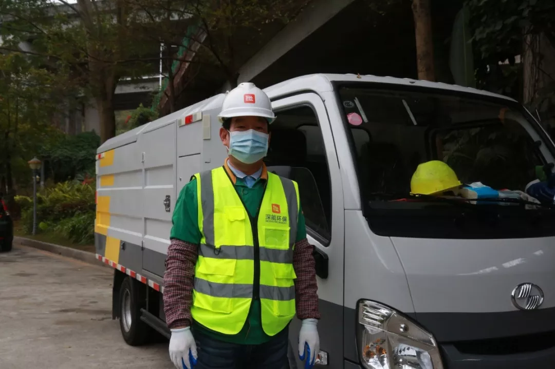 上午7點(diǎn)半,第一個(gè)到崗的田夫珍開始測(cè)量體溫,消毒后穿上印有“深能環(huán)?!钡鸟R甲,戴上安全帽,檢查車輛消殺情況。8點(diǎn)整,他和14名同事一起出發(fā),分赴鹽田7條線路,開始和餐廚垃圾打交道。