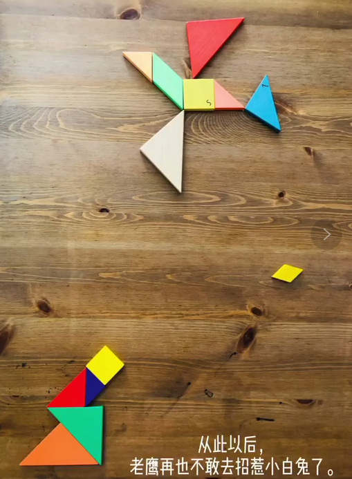 劉鼒彧在完成課后作業(yè)時(shí),和媽媽一起通過“七巧板”拼成了很多圖形,有大炮、小白兔、老鷹、花叢……鼒彧突發(fā)奇想,“我可以用七巧板來講一個(gè)故事呀!”,不一會(huì)兒,她一邊用七巧板擺著各種形狀,一邊開始講述自己的原創(chuàng)故事——《勇敢的小兔》。