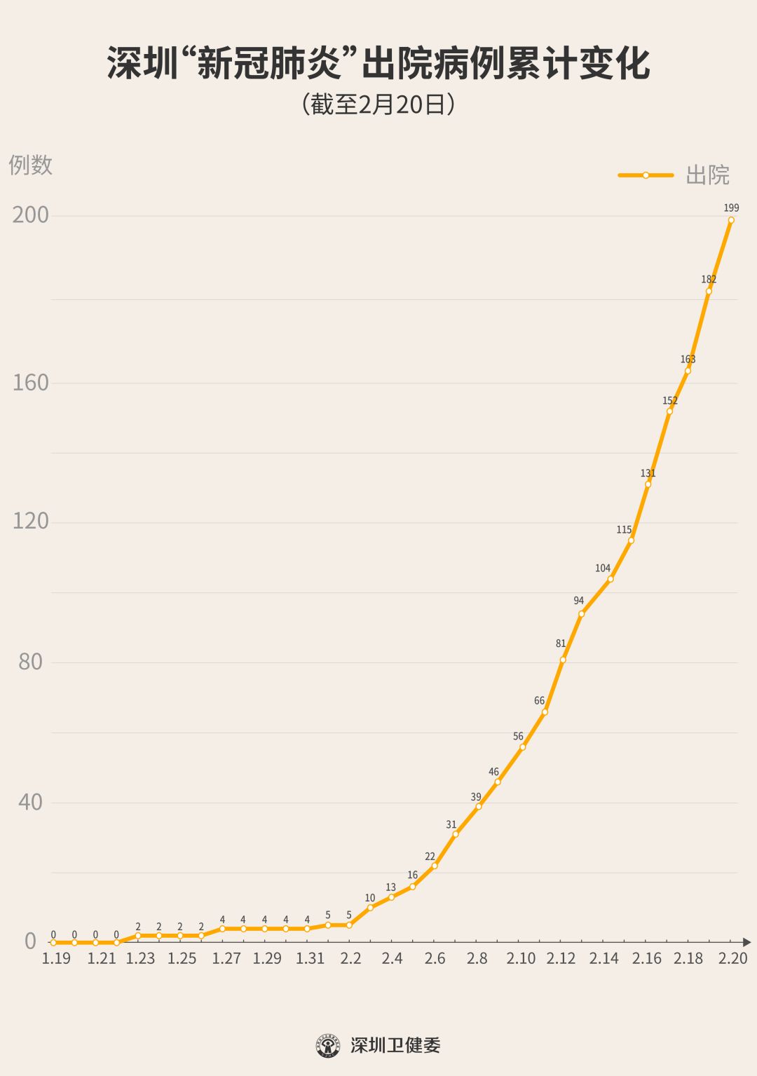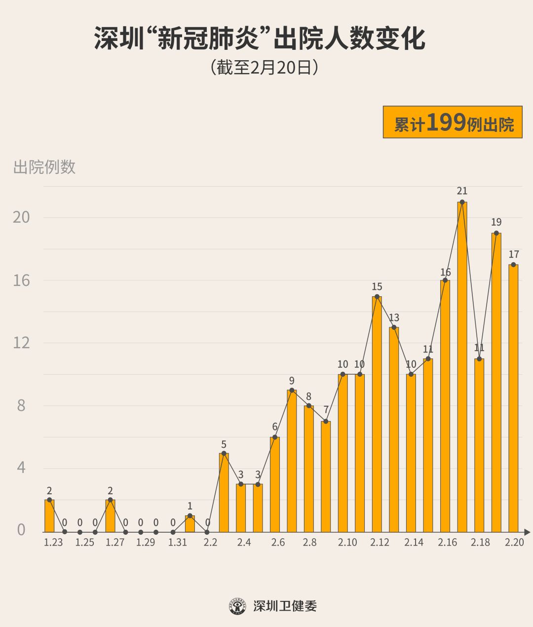 2月20日下午,經(jīng)專家組會診,深圳再有17名新型冠狀病毒肺炎確診患者出院,累計達199人,連續(xù)18天有人出院。