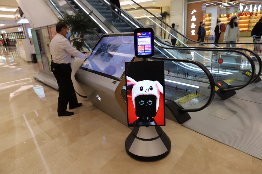 走在商場中,隨時可以看到保潔人員在消毒清潔。在商場一樓中庭導(dǎo)購屏和導(dǎo)購機器人處,保潔人員用消毒水反復(fù)擦拭屏幕。據(jù)悉,商場每小時巡回對扶梯、電梯、衛(wèi)生間、消防通道、導(dǎo)視屏、扶手欄桿、休閑椅、門把手、垃圾房、垃圾桶等地進行消毒。