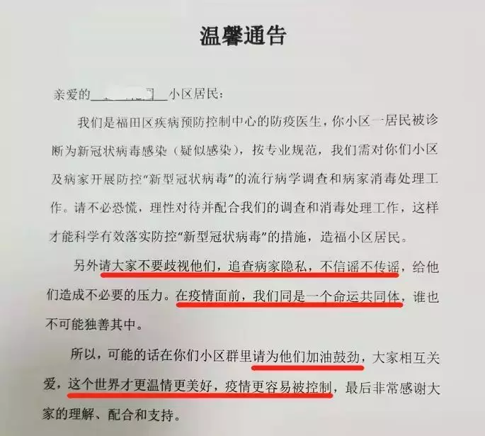 “疫情面前,我們同是一個命運共同體”“大家相互關(guān)愛,這個世界才更溫情美好,疫情更容易被控制……”1月30日,位于深圳福田區(qū)的一小區(qū)出現(xiàn)新冠肺炎疑似感染病例,福田區(qū)疾病預防控制中心的防疫醫(yī)生隨即發(fā)布了這則通告,瞬間刷屏了深圳人的朋友圈。通告除了呼吁小區(qū)居民配合調(diào)查及消毒處理工作外,還特地懇請大家“不要歧視,在疫情面前,我們是同一個命運共同體,誰也不可能獨善其身?!绷攘葦?shù)字的“請求”,感動無數(shù)人。