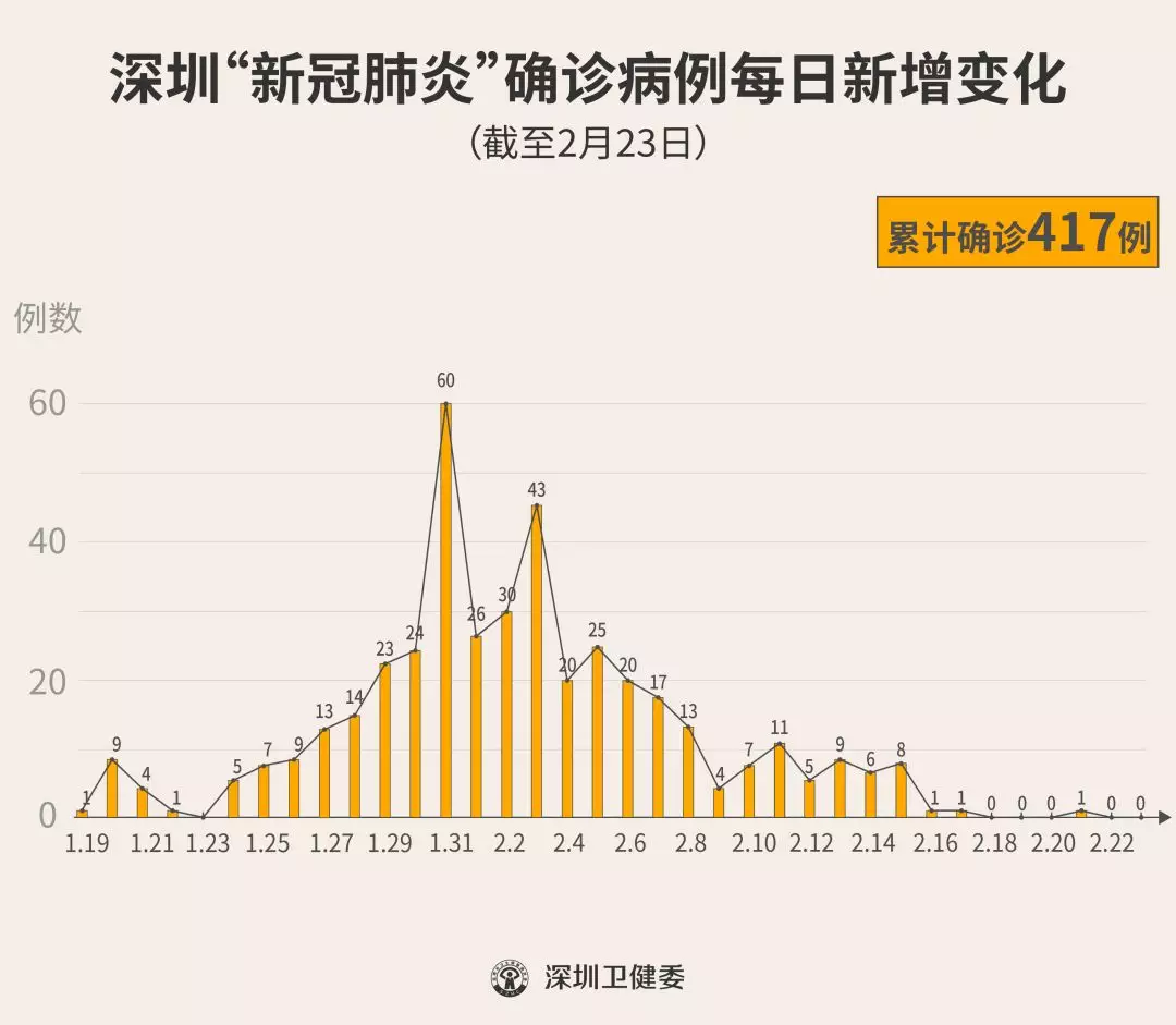 截至2月23日24時(shí),深圳累計(jì)報(bào)告“新冠肺炎”確診病例417例。2月23日當(dāng)天全市無(wú)新增確診病例。 ▲新增出院病例已超過(guò)新增確診病例 累計(jì)報(bào)告確診病例中,男性197例、女性220例。 按照病例管理地區(qū)劃分,南山區(qū)87例、福田區(qū)81例、龍崗區(qū)71例、寶安區(qū)62例、龍華區(qū)34例、羅湖區(qū)32例、光明區(qū)11例、坪山區(qū)7例、鹽田區(qū)6例、大鵬新區(qū)2例、其他(指由機(jī)場(chǎng)、車(chē)站、碼頭、關(guān)口、路卡等直接送往定點(diǎn)醫(yī)院的)24例。 目前,重癥5例、危重癥8例,死亡3例,累計(jì)出院237例。 177例確診病例均在深圳市第三人民醫(yī)院隔離治療。 159例密切接觸者正在接受醫(yī)學(xué)觀(guān)察。 資料來(lái)源:深圳市疾控中心、深圳市衛(wèi)健委、廣東省衛(wèi)健委