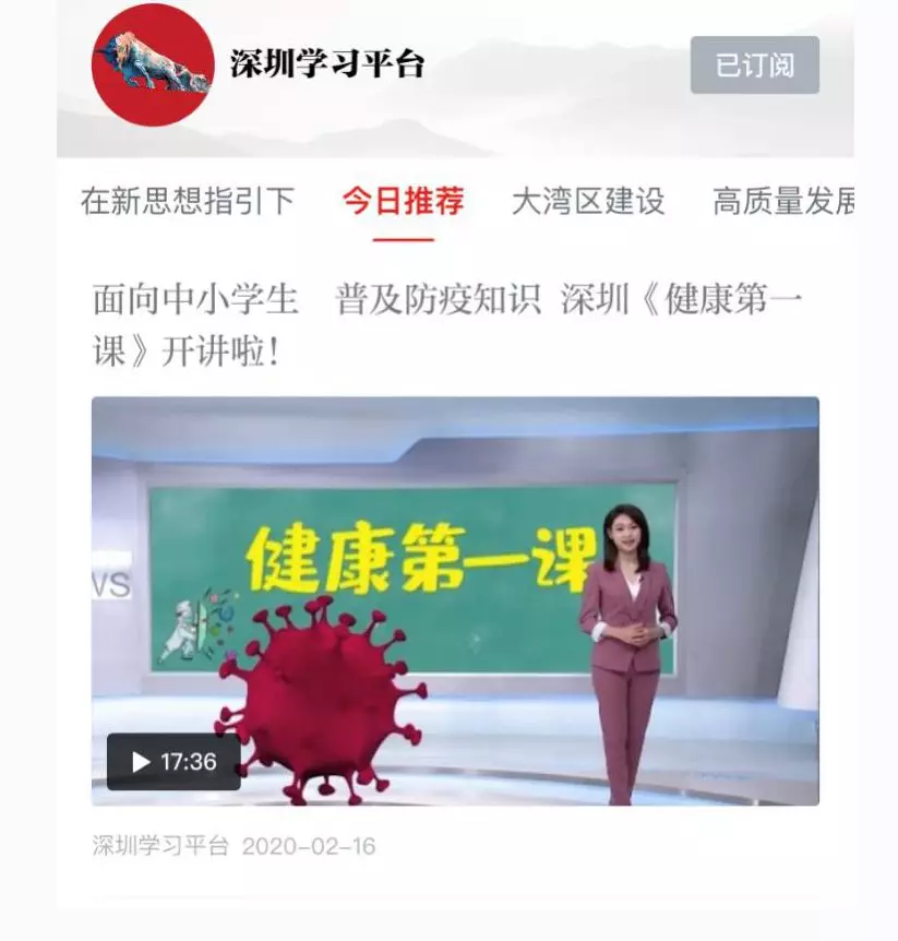 2月17日,“學(xué)習(xí)強國”深圳學(xué)習(xí)平臺編輯部和深圳市疾控中心聯(lián)合策劃推出的《健康第一課》節(jié)目在“學(xué)習(xí)強國”深圳學(xué)習(xí)平臺首發(fā),宣傳普及新型冠狀病毒肺炎防控知識,助力做好學(xué)校疫情防控工作,廣大學(xué)生家長積極收看,反響良好。
