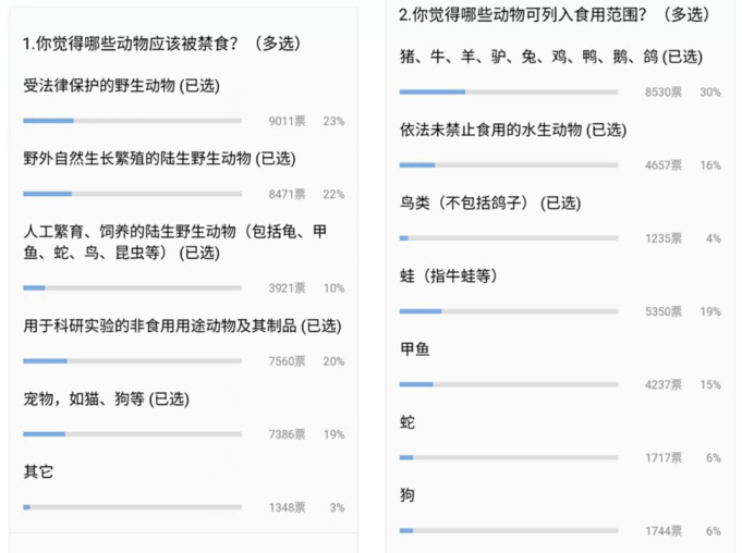 網(wǎng)友投出9011票,贊成“受法律保護(hù)的野生動(dòng)物”應(yīng)該被禁食,占比23%;另有8471票,22%的網(wǎng)友支持禁食“野外自然生長(zhǎng)繁殖的陸生野生動(dòng)物”。對(duì)于“用于科研實(shí)驗(yàn)的非食用用途動(dòng)物及其制品”選項(xiàng),有20%的網(wǎng)友(7560票)支持禁食。禁食的投票選項(xiàng)中,還有19%的網(wǎng)友贊成禁食貓狗等寵物(7386票),10%的網(wǎng)友贊成禁食包括龜、甲魚(yú)、蛇、鳥(niǎo)、昆蟲(chóng)等人工繁育、飼養(yǎng)的陸生野生動(dòng)物,票數(shù)為3921票。