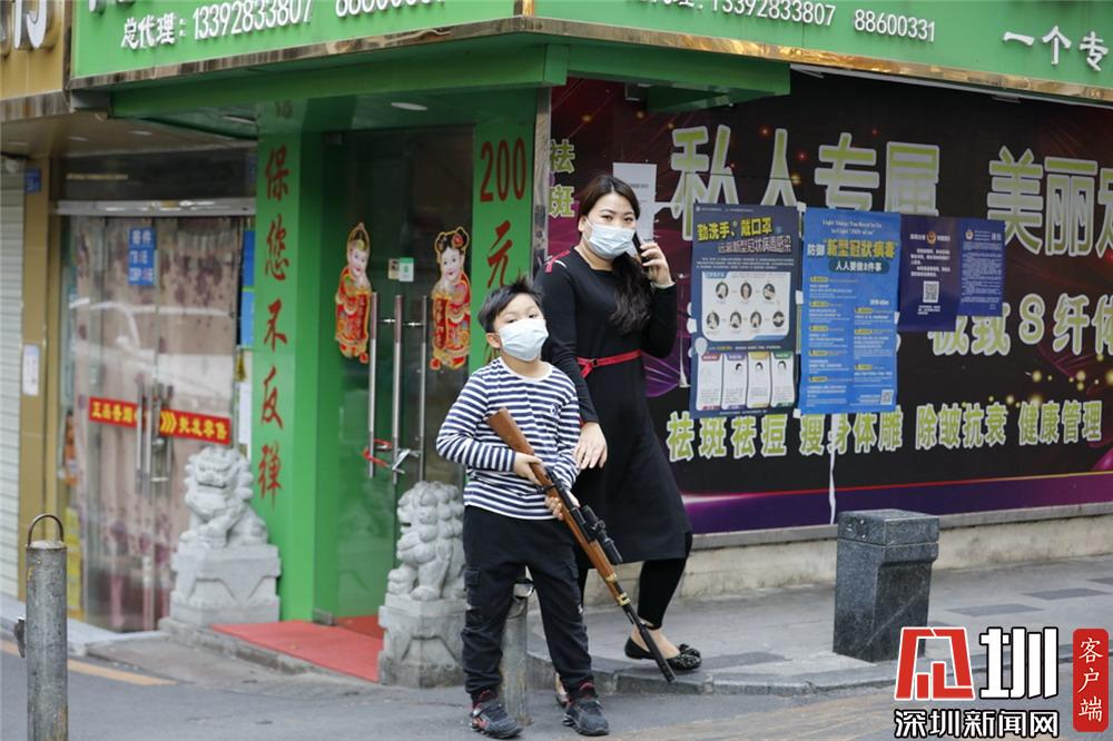 福田區(qū)新洲村,一對(duì)戴著口罩的母子。