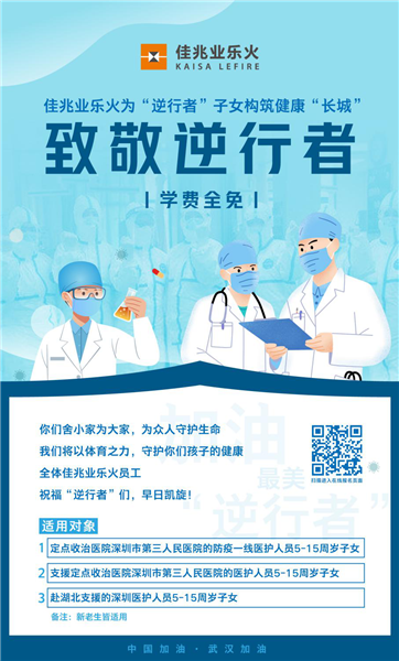 見圳客戶端·深圳新聞網(wǎng)2月29日訊(見圳客戶端、深圳新聞網(wǎng)記者 李云云 通訊員 張慧)突如其來的新冠肺炎疫情牽動著人們的心,在這場沒有硝煙的戰(zhàn)斗中,廣大醫(yī)護人員舍小家為大家,日夜沖鋒守護在一線,成為這個特殊春節(jié)里最美的“逆行者”。日前,記者獲悉,佳兆業(yè)文體集團旗下的佳兆業(yè)樂火國際文體學(xué)校將于3月1日到12月31日,為深圳定點收治醫(yī)院——深圳市第三人民醫(yī)院的防疫一線醫(yī)護人員以及赴鄂支援的深圳醫(yī)護人員子女提供免費培訓(xùn)課程包,為“逆行者”子女構(gòu)筑健康“長城”。