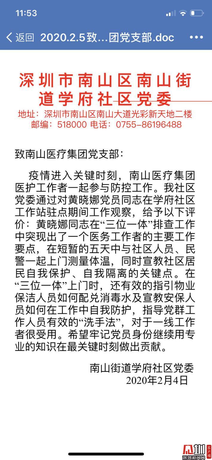 南山區(qū)南山街道學(xué)府社區(qū)黨委對(duì)黃曉娜的表揚(yáng)信