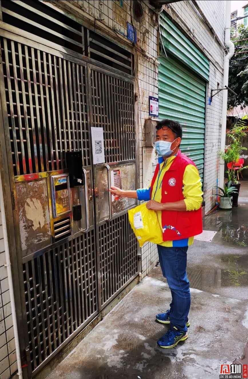 社區(qū)工作人員陳強(qiáng)上門為居家隔離住戶派送快遞