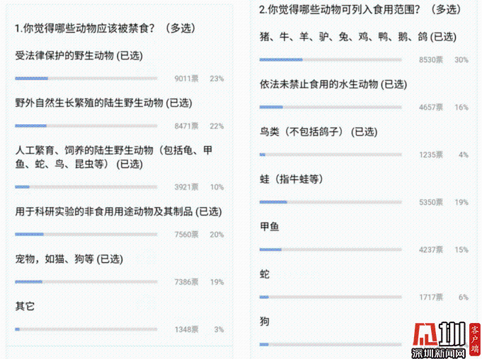 2月26日,深圳新聞網(wǎng)微信公眾號(hào)發(fā)布正在征求意見的《條例》后,當(dāng)天傍晚有超過9000名網(wǎng)友參與投票,熱情高漲的網(wǎng)友還留言戲稱廣東菜譜“水魚燜雞”或許從此退出,也有人猜測(cè)以田雞(牛蛙)為主打的餐館要“涼涼”了。(相關(guān)報(bào)道:深圳最嚴(yán)禁食野生動(dòng)物條例征求意見近萬網(wǎng)友投票:甲魚牛蛙該不該被禁?)