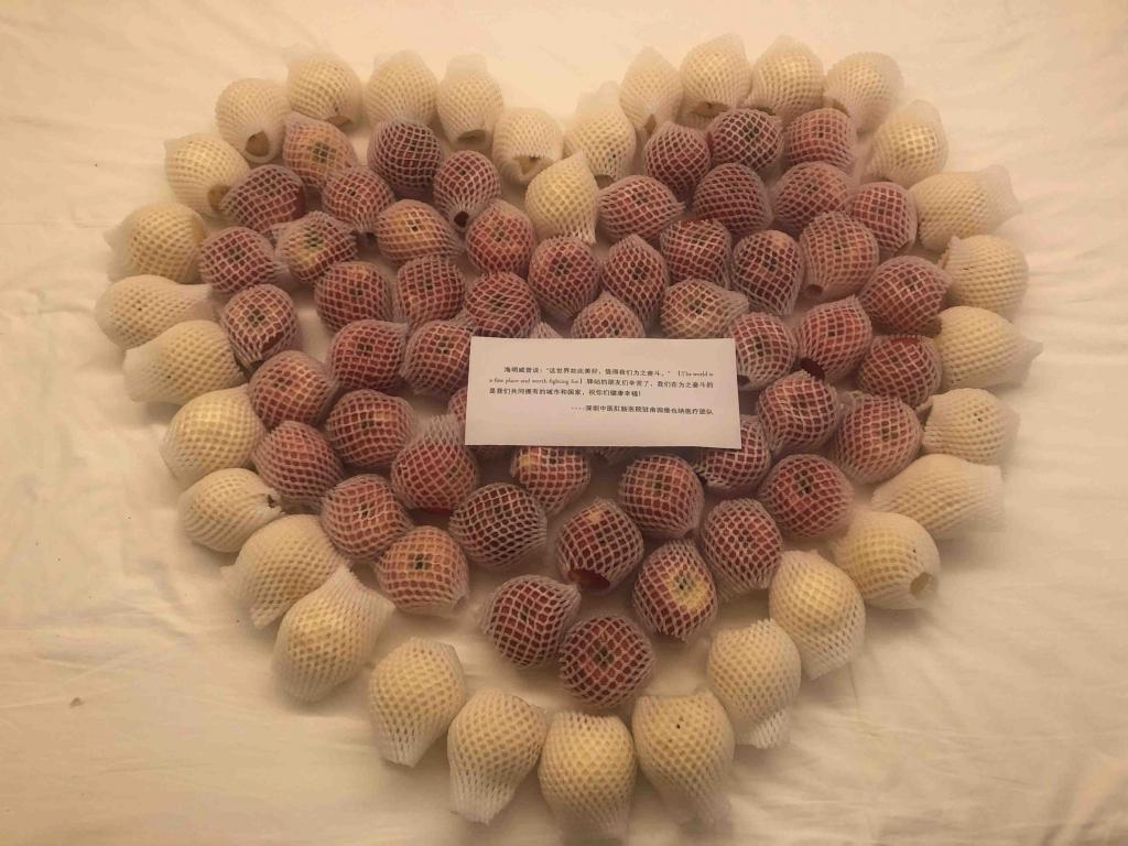 ▲深圳中醫(yī)肛腸醫(yī)院醫(yī)療團(tuán)隊為健康驛站醫(yī)學(xué)觀察人員贈送的愛心水果。受訪者供圖