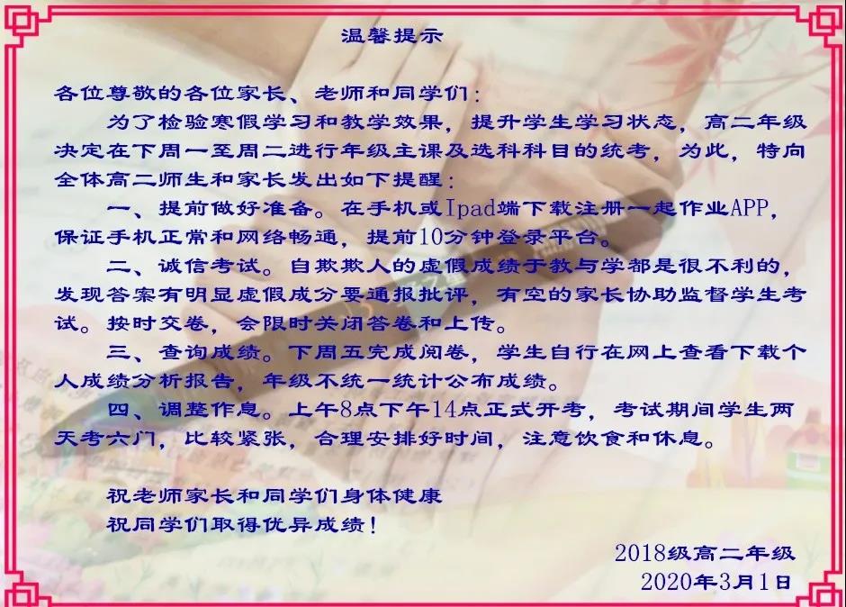 為了提高考試的可信度,考前各班級(jí)還進(jìn)行了誠信教育,讓學(xué)生明白誠信考試的重要性以及自欺欺人的危害,并發(fā)動(dòng)居家的家長積極配合監(jiān)考??记?,學(xué)校也向老師學(xué)生和家長發(fā)了提示,提醒網(wǎng)上考試注意事項(xiàng)。