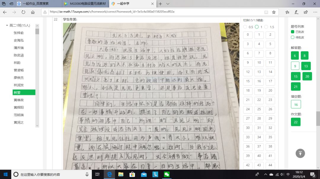 早在網(wǎng)課開始第二周,針對(duì)老師們對(duì)網(wǎng)課效率不高的顧慮,高二年級(jí)就做了一次網(wǎng)上調(diào)查,絕大部分老師贊成進(jìn)行一次網(wǎng)上考試,以檢驗(yàn)網(wǎng)課的學(xué)習(xí)效果,以便調(diào)整教學(xué)。之后,學(xué)校開始著手準(zhǔn)備網(wǎng)上考試,向技術(shù)平臺(tái)提交學(xué)生和老師信息,下發(fā)《一起作業(yè)學(xué)生注冊(cè)登錄指引》和《一起作業(yè)教師作業(yè)批改操作指南》。年級(jí)各備課組開始命題,為了檢驗(yàn)二實(shí)“線上學(xué)堂”的實(shí)效,學(xué)校要求命題的范圍以直播課內(nèi)容為主,兼顧寒假作業(yè)??记耙恢?,各備課組都上交平臺(tái)進(jìn)行試卷制作。2月26日,網(wǎng)上作業(yè)批改功能正式上線,高二年級(jí)要求備課組在考試之前至少利用線上平臺(tái)布置批改一次網(wǎng)上作業(yè),積累經(jīng)驗(yàn),提醒平臺(tái)改進(jìn)不完善的問題,及時(shí)更新,同時(shí)讓學(xué)生和老師熟悉操作技巧。備課組在考前都向?qū)W生發(fā)布了考試注意事項(xiàng),要求學(xué)生豎拍照片,注意字跡大小和拍照清晰度,單題上傳,試卷在閱讀頁面和題目設(shè)置也做了優(yōu)化,大大方便了學(xué)生答題,有效減輕老師改卷負(fù)擔(dān),提高了閱卷的效率。