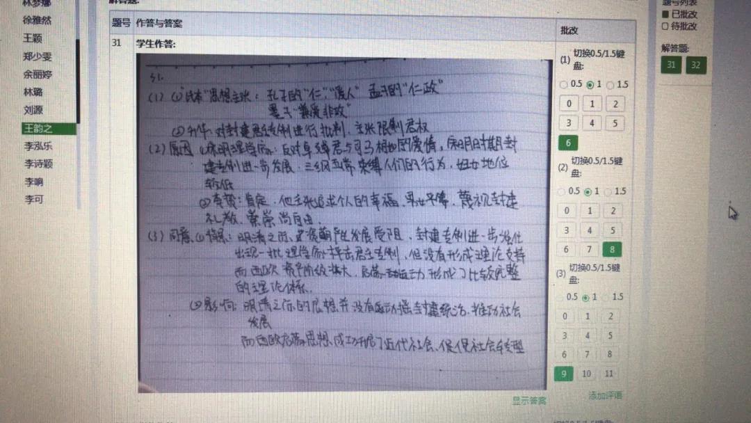“考試期間,家長們積極配合監(jiān)考,上傳照片;各班班主任全程陪考,隨時(shí)反饋解決班級(jí)學(xué)生出現(xiàn)的考試問題;各備課組老師網(wǎng)上巡考,提醒學(xué)生答題注意事項(xiàng),在線隨時(shí)回答和處理學(xué)生疑問;平臺(tái)的技術(shù)支持人員全天候?qū)B氃诰€服務(wù),全力解答考試中的技術(shù)問題?!倍?shí)高二年級(jí)主任宋德勝告訴記者,兩天的“云考試”,整體非常順利,網(wǎng)絡(luò)平穩(wěn),全年級(jí)395人參加考試,無一缺考,全部上傳了試卷。他表示,高二年級(jí)作為廣東省首屆新高考改革年級(jí),也成為了這次“云考試”的試點(diǎn)年級(jí),每位學(xué)生的考試科目除語數(shù)外三門必考,其余根據(jù)自己選科情況六選三,每個(gè)學(xué)生考六科。目前,現(xiàn)在各備課組已經(jīng)投入緊張的閱卷中,確保周五前完成閱卷任務(wù)。