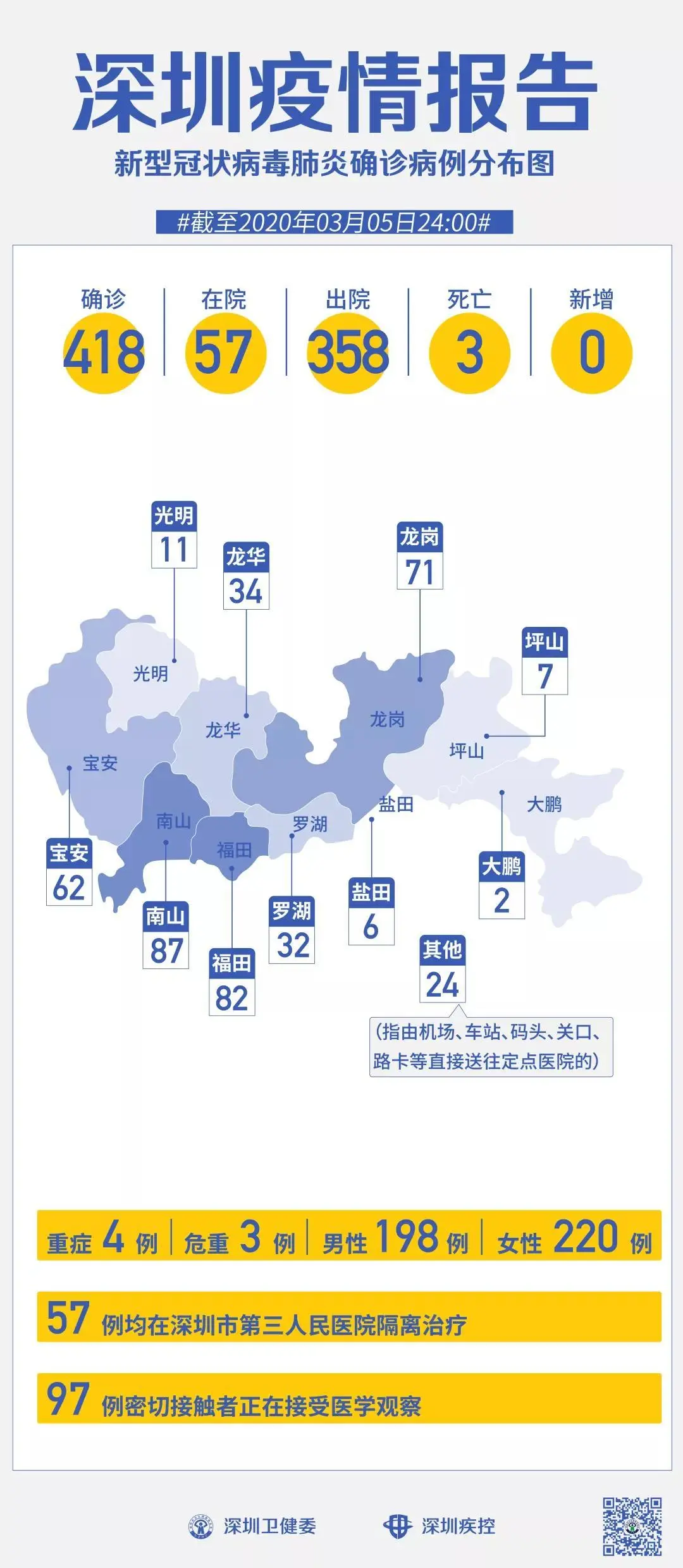 截至3月5日24時(shí),深圳累計(jì)報(bào)告“新冠肺炎”確診病例418例。3月5日當(dāng)天全市無新增確診病例,當(dāng)天出院病例8例(從2月26日起不再公布出院個(gè)案)。 累計(jì)報(bào)告確診病例中,男性198例、女性220例。 按照病例管理地區(qū)劃分,南山區(qū)87例、福田區(qū)82例、龍崗區(qū)71例、寶安區(qū)62例、龍華區(qū)34例、羅湖區(qū)32例、光明區(qū)11例、坪山區(qū)7例、鹽田區(qū)6例、大鵬新區(qū)2例、其他(指由機(jī)場(chǎng)、車站、碼頭、關(guān)口、路卡等直接送往定點(diǎn)醫(yī)院的)24例。 目前,重癥4例、危重癥3例,死亡3例,累計(jì)出院358例。 57例確診病例均在深圳市第三人民醫(yī)院隔離治療。 97例密切接觸者正在接受醫(yī)學(xué)觀察。 資料來源:深圳市疾控中心、深圳市衛(wèi)健委、廣東省衛(wèi)健委