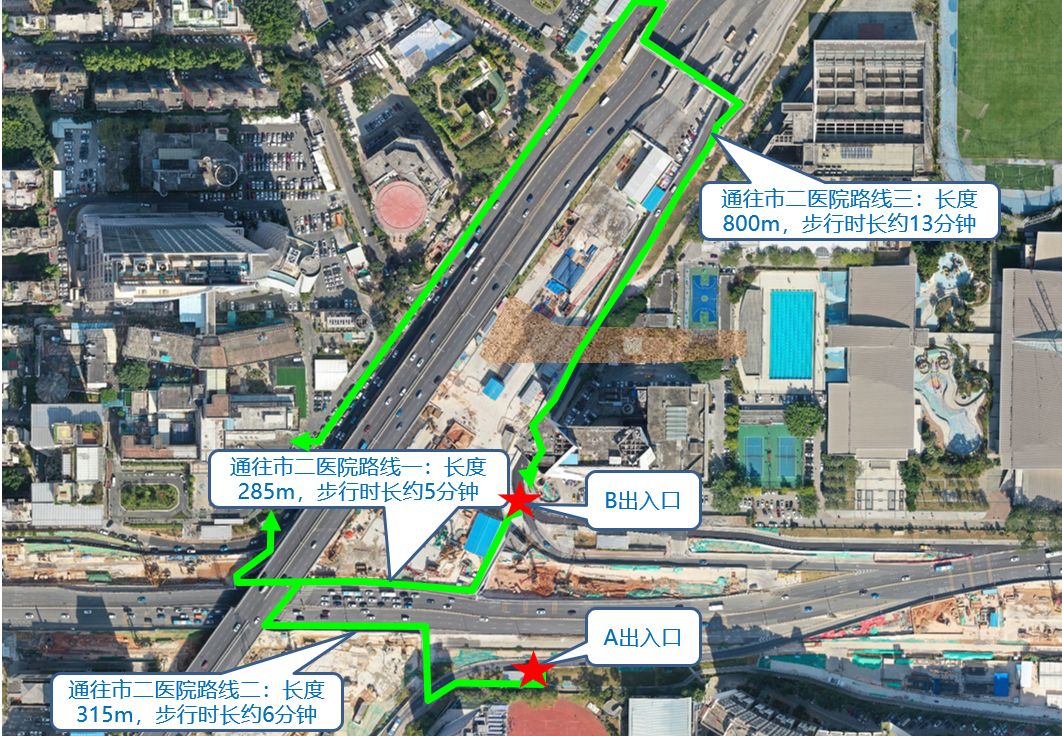 1.去往市二醫(yī)院的市民可從地鐵黃木崗站B出入口出站,沿地面新建的風(fēng)雨連廊到達(步行時間約5分鐘)。(詳見圖1)