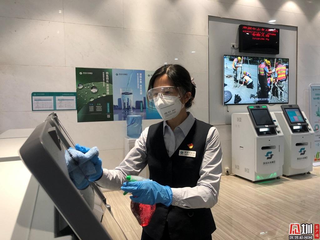 為客戶提供安全、優(yōu)質(zhì)的服務(wù),是深水人的不懈追求。福田分公司福田營業(yè)廳楊麗娜,正對自動服務(wù)機進行消毒。