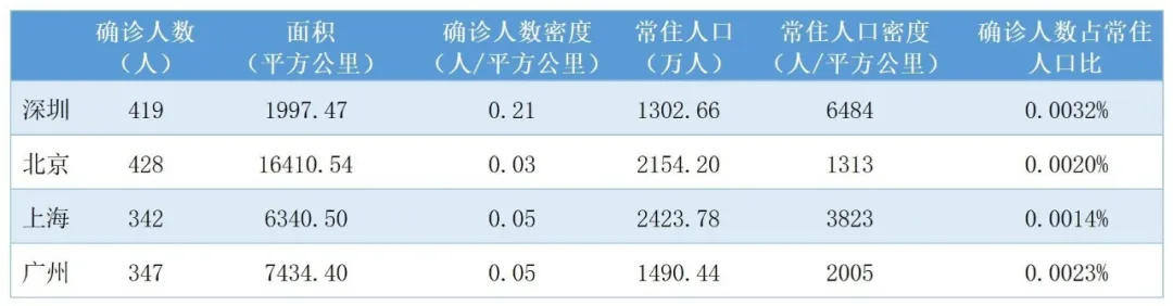 ▲深圳常住人口密度大,人員流動頻繁,疫情防控難度高,導(dǎo)致確診人數(shù)在北、上、廣、深四大城市中最多,分布密度位也居首位,對防控工作形成巨大壓力。