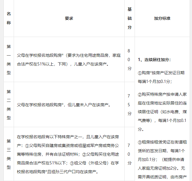 租房:父母、祖父母、外祖父母或法定監(jiān)護(hù)人在申請學(xué)校學(xué)區(qū)內(nèi)租房且能提供《房屋租賃憑證》或《公共租賃房合同》,按簽發(fā)日期每滿一個月加0.1分,其他類住房不積分。