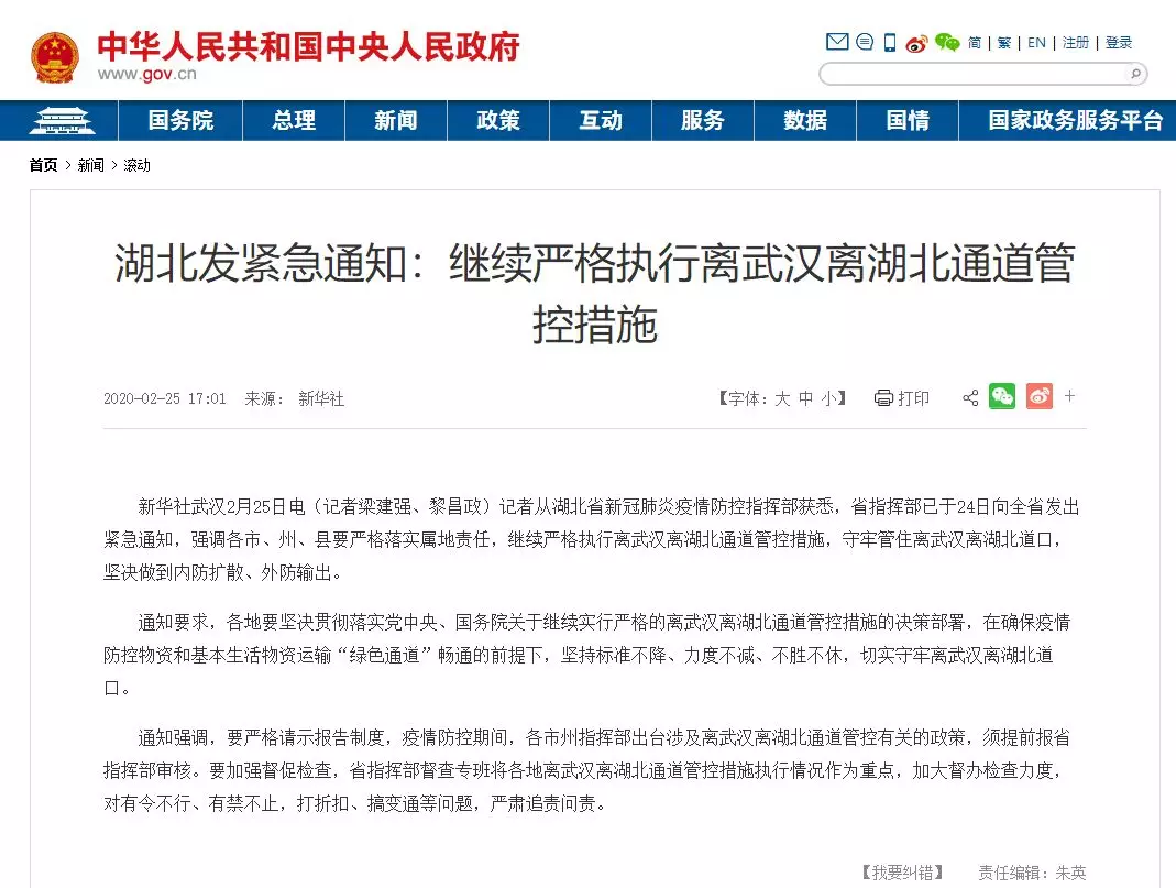 根據(jù)湖北的緊急通知,繼續(xù)嚴(yán)格執(zhí)行離武漢離湖北通道管控措施。