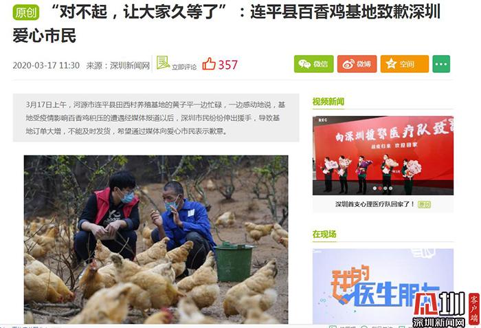 深圳新聞網(wǎng)愛(ài)心助農(nóng)的報(bào)道推出后,得到深圳各界和愛(ài)心市民的踴躍參與,大家紛紛通過(guò)報(bào)道中公布的微店訂購(gòu)愛(ài)心雞。突然猛增的訂單,讓連平農(nóng)民感動(dòng)的同時(shí),也倍感壓力,因?yàn)榘傧汶u都是現(xiàn)殺現(xiàn)寄,全程冷鏈配送,所以導(dǎo)致有些訂單滯后。3月17日,連平農(nóng)戶(hù)還通過(guò)深圳新聞網(wǎng)向深圳愛(ài)心市民發(fā)出致歉信--《“對(duì)不起,讓大家久等了”:連平縣百香雞基地致歉深圳愛(ài)心市民》,通過(guò)深圳新聞網(wǎng)向深圳愛(ài)心市民表示謝意的同時(shí),又表達(dá)歉意。