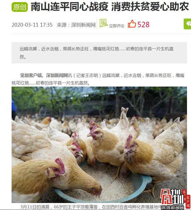 今年新冠肺炎疫情發(fā)生以后,南連農(nóng)業(yè)對(duì)口幫扶的河源連平四個(gè)基地受到影響,共有近2萬(wàn)只百香雞待銷(xiāo),其中連平縣田源鎮(zhèn)田西村基地的6000多只百香雞無(wú)人問(wèn)津。就在村民一籌莫展的時(shí)候,深圳新聞網(wǎng)等媒體知曉后,迅速進(jìn)行深度采訪(fǎng),3月11日刊發(fā)了《南山連平同心戰(zhàn)疫 消費(fèi)扶貧愛(ài)心助農(nóng)》的報(bào)道,呼吁深圳的企事業(yè)單位以及愛(ài)心市民,通過(guò)“以購(gòu)代捐”“以買(mǎi)代幫”的方式參與消費(fèi)扶貧,幫助連平農(nóng)戶(hù)們渡過(guò)難關(guān)。