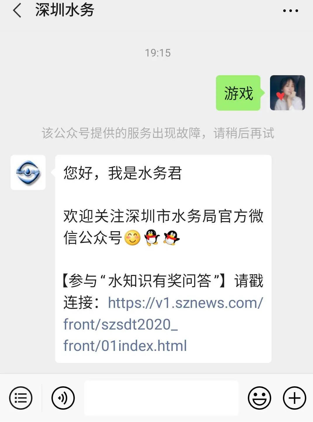 如果您已經(jīng)關(guān)注了“深圳水務(wù)”,可以在公眾號(hào)留言欄輸入“游戲”、“答題”“紅包”等關(guān)鍵詞哦。